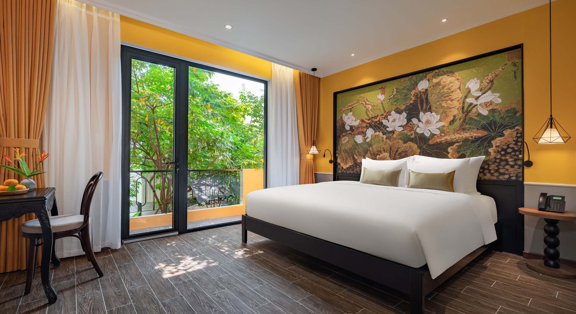 Stay in vibrancy of bright yellow and comfort overlooking the tranquil houses. Designed with traditional Vietnamese influences and elegance of rustic paintings.