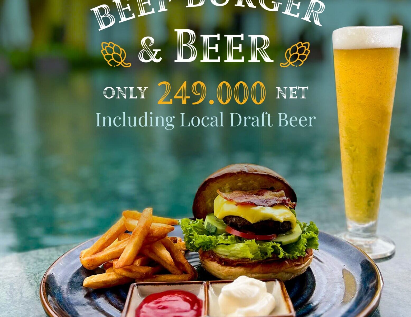 Savor a flavorful combination of our signature beef burger, layered with fresh toppings and melted cheese, served alongside crispy golden fries. Paired with a cold local draft beer, this satisfying set is perfect for a laid-back meal by the pool or a casual break during your day. A simple yet comforting treat that brings both indulgence and refreshment in every bite.