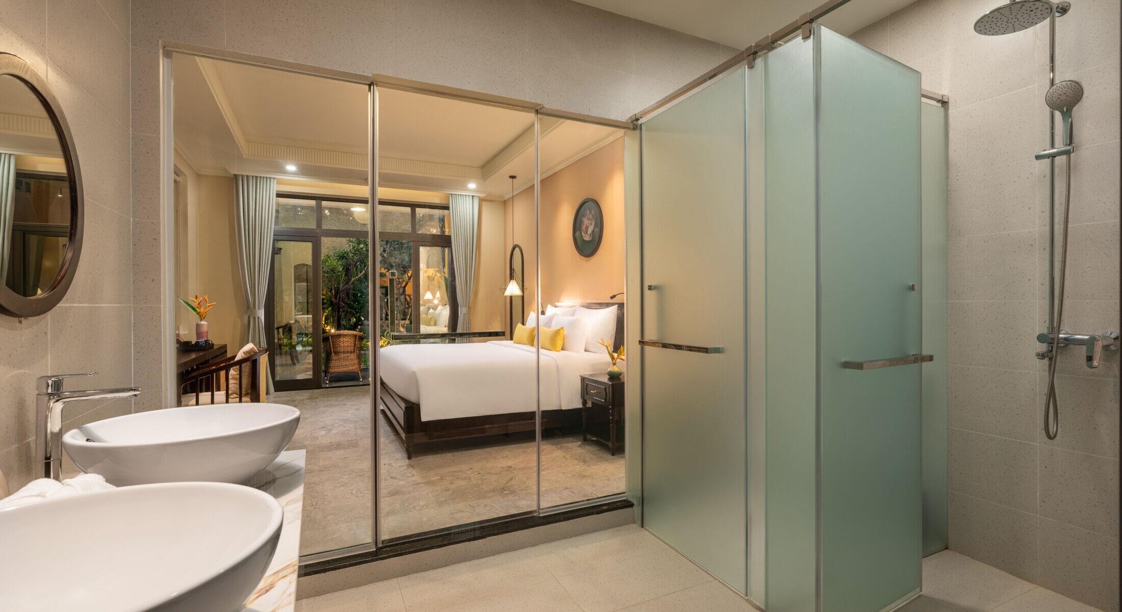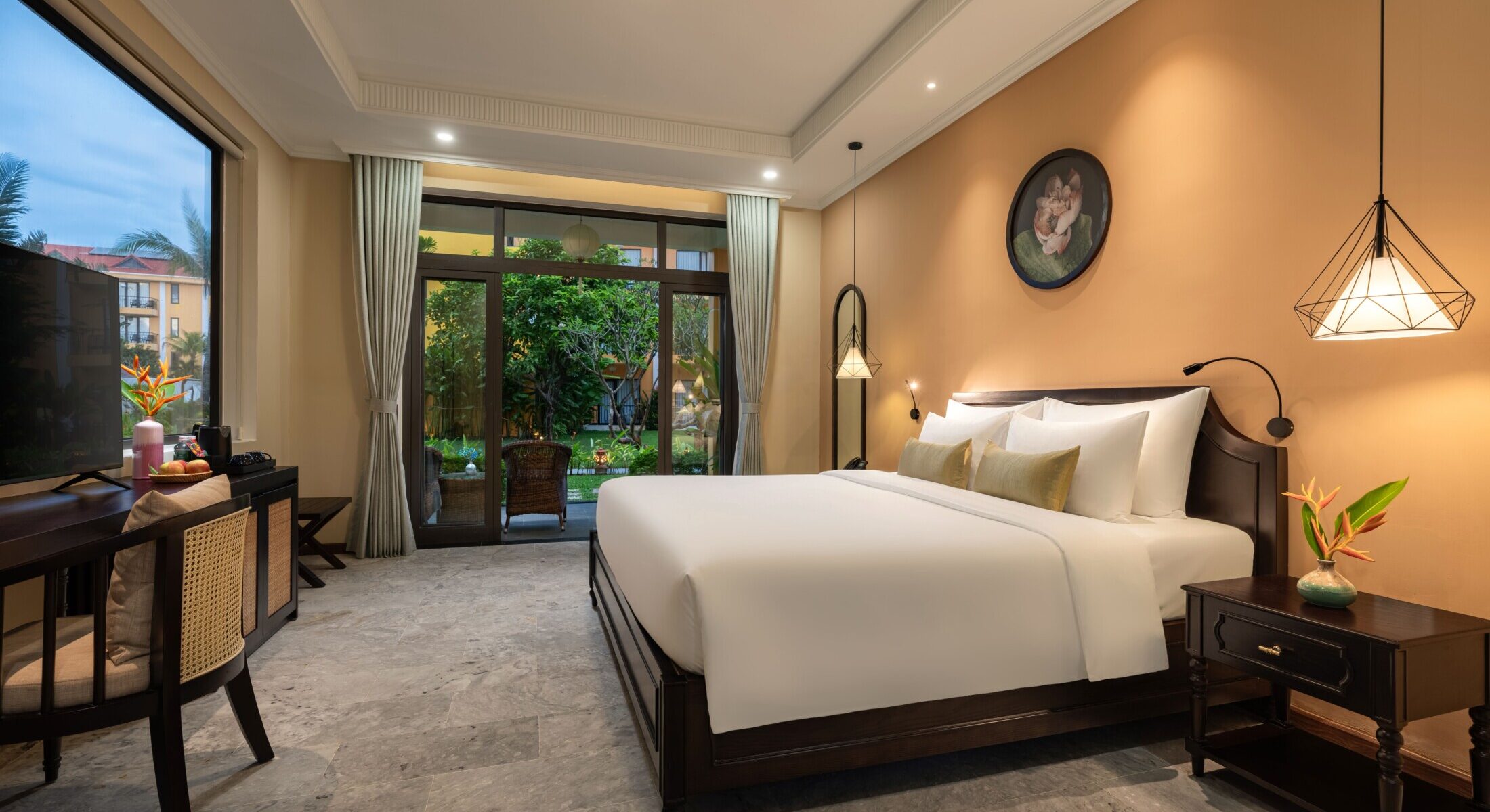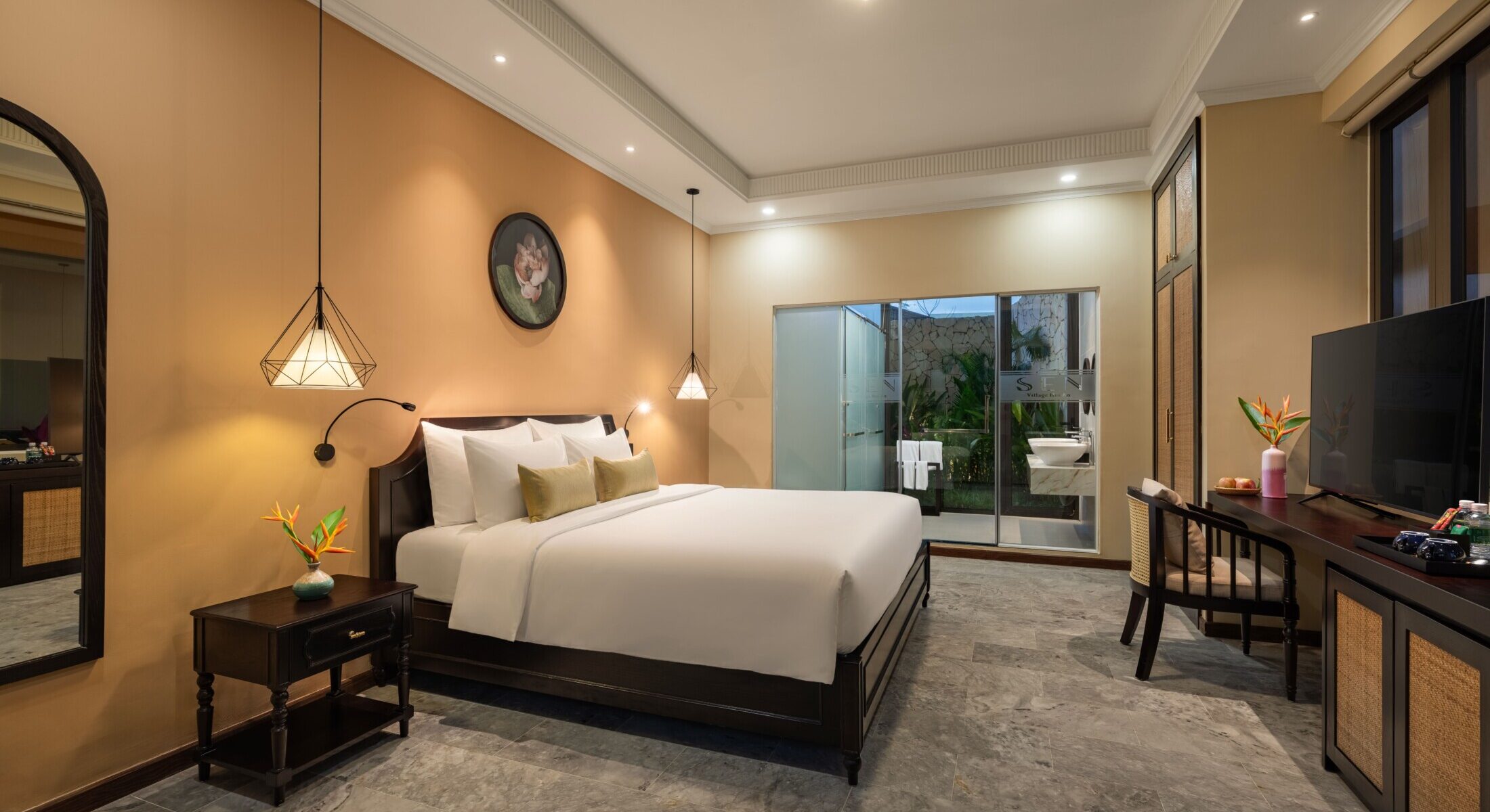 Đắm mình trong sự thư giãn và thanh bình với tầm nhìn ra khu vườn xanh mát. Các phòng Sen Bliss Villa được thiết kế từ những đường cong tinh tế, chất liệu tự nhiên và tông màu nhã nhặn, mang đến không gian hài hòa tuyệt đối với thiên nhiên.